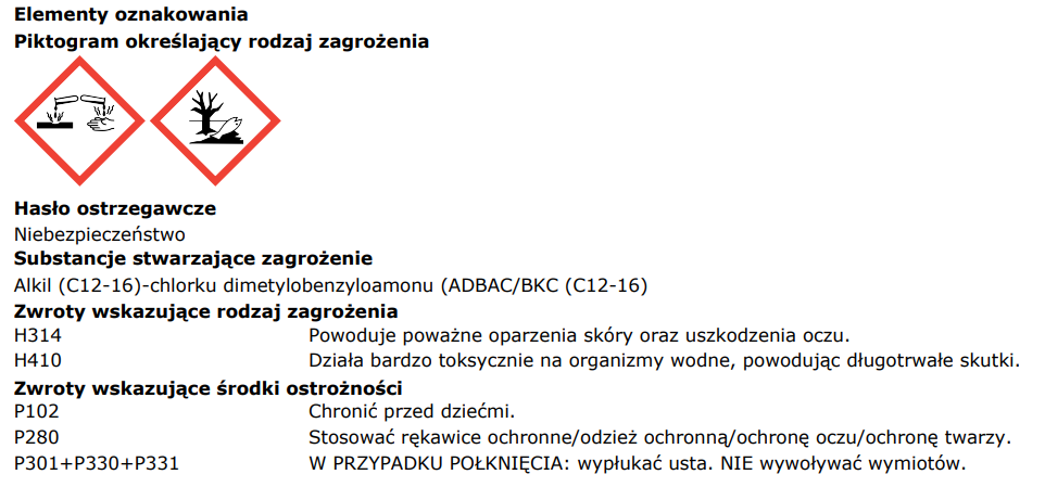P102 – Chronić przed dziećmi P280 – Stosować rękawice ochronne/odzież ochronną/ochronę oczu/ochronę twarzy. P301+P330+P331 – W PRZYPADKU POŁKNIĘCIA: wypłukać usta. NIE wywoływać wymiotów P303+P361+P353 – W PRZYPADKU KONTAKTU ZE SKÓRĄ (lub z włosami): Natychmiast zdjąć całą zanieczyszczoną odzież. Spłukać skórę pod strumieniem wody [lub prysznicem]. P305+P351+P338 – W PRZYPADKU DOSTANIA SIĘ DO OCZU: Ostrożnie płukać wodą przez kilka minut. Wyjąć soczewki kontaktowe, jeżeli są i można je łatwo usunąć. Nadal płukać P310 – Natychmiast skontaktować się z OŚRODKIEM ZATRUĆ / lekarzem P501 – Pojemnik usuwać do odpowiednio oznakowanych pojemników na odpady zgodnie z krajowymi przepisami